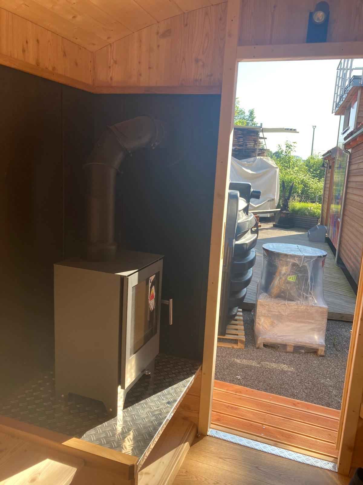 • Ein kleiner, effizienter Holzofen sorgt für Wärme und Gemütlichkeit – auch an kühlen Tagen.
