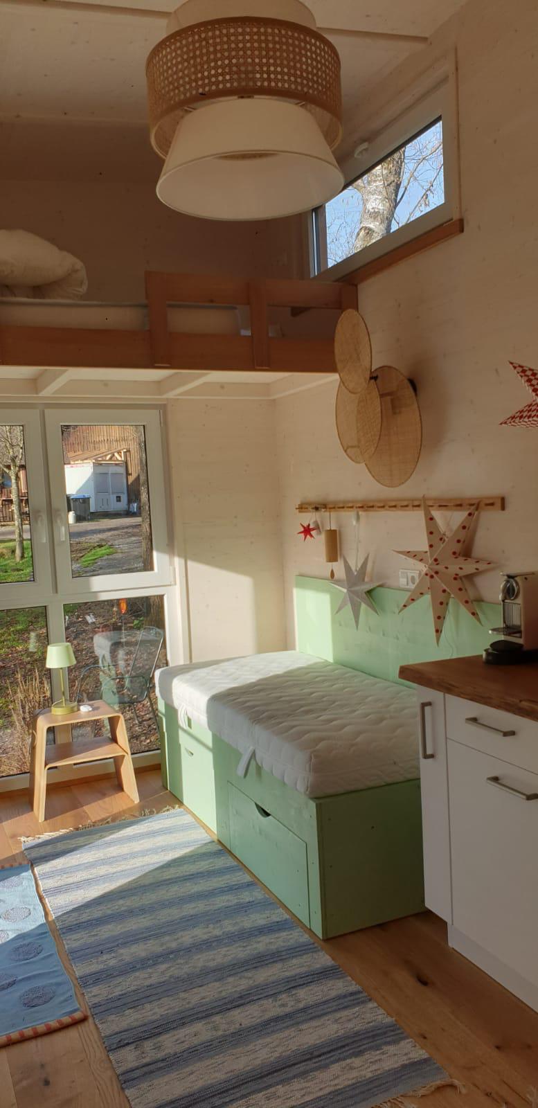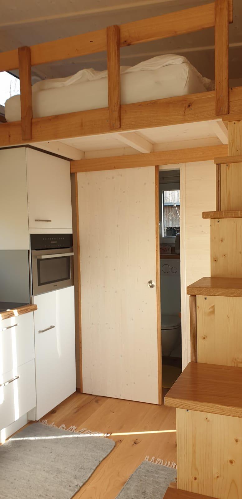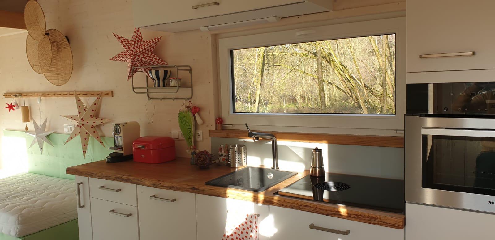 Die Küche mit integrierter Waschmaschine macht das Tinyhaus vollständig alltagstauglich –