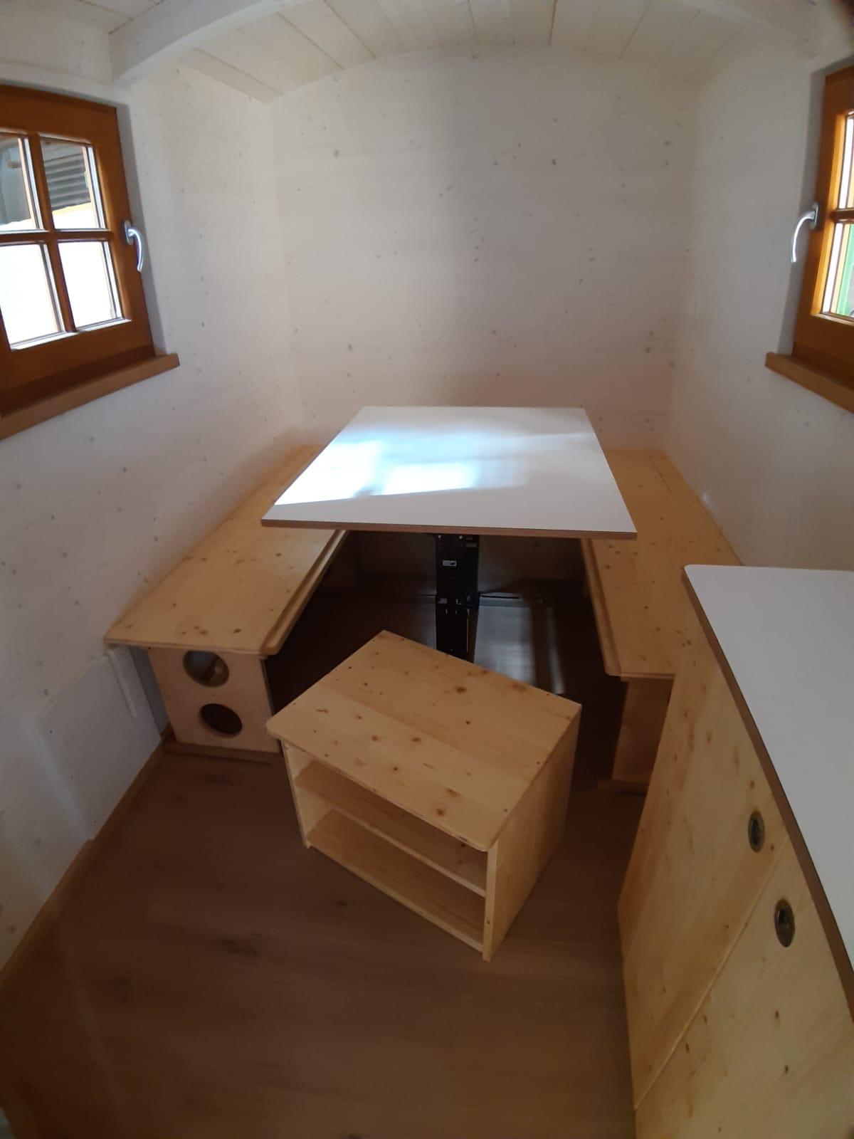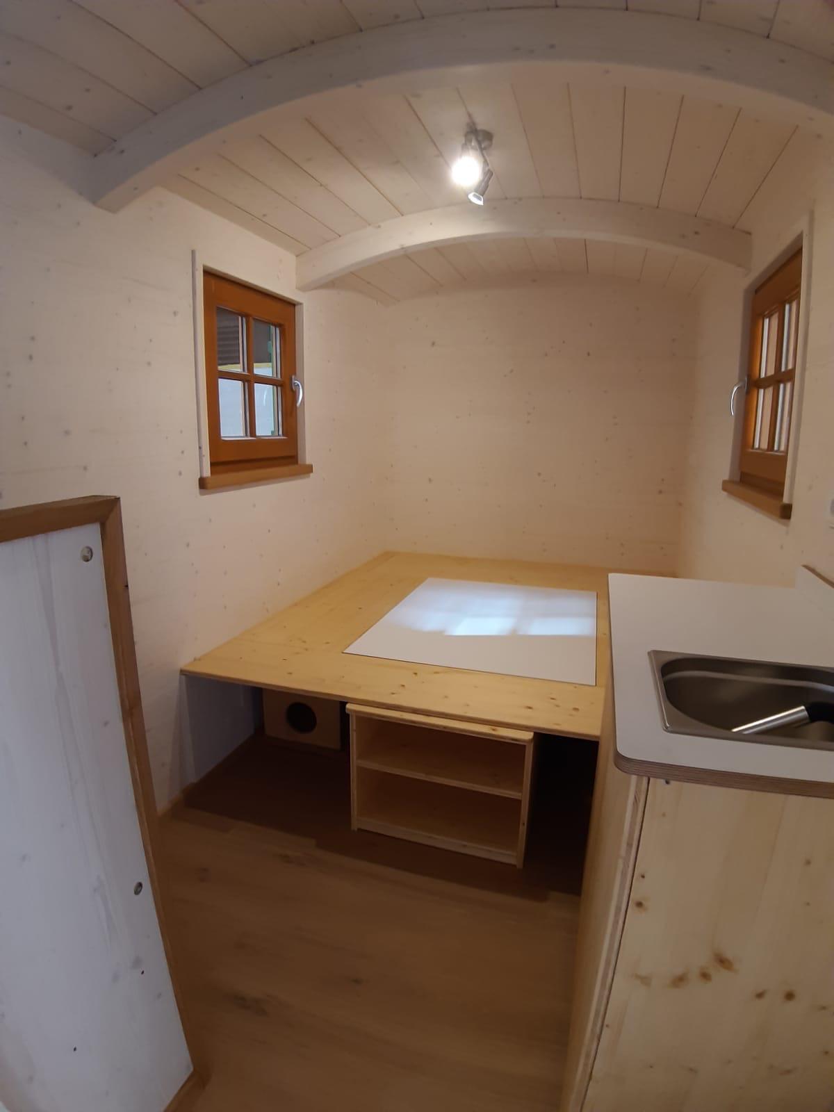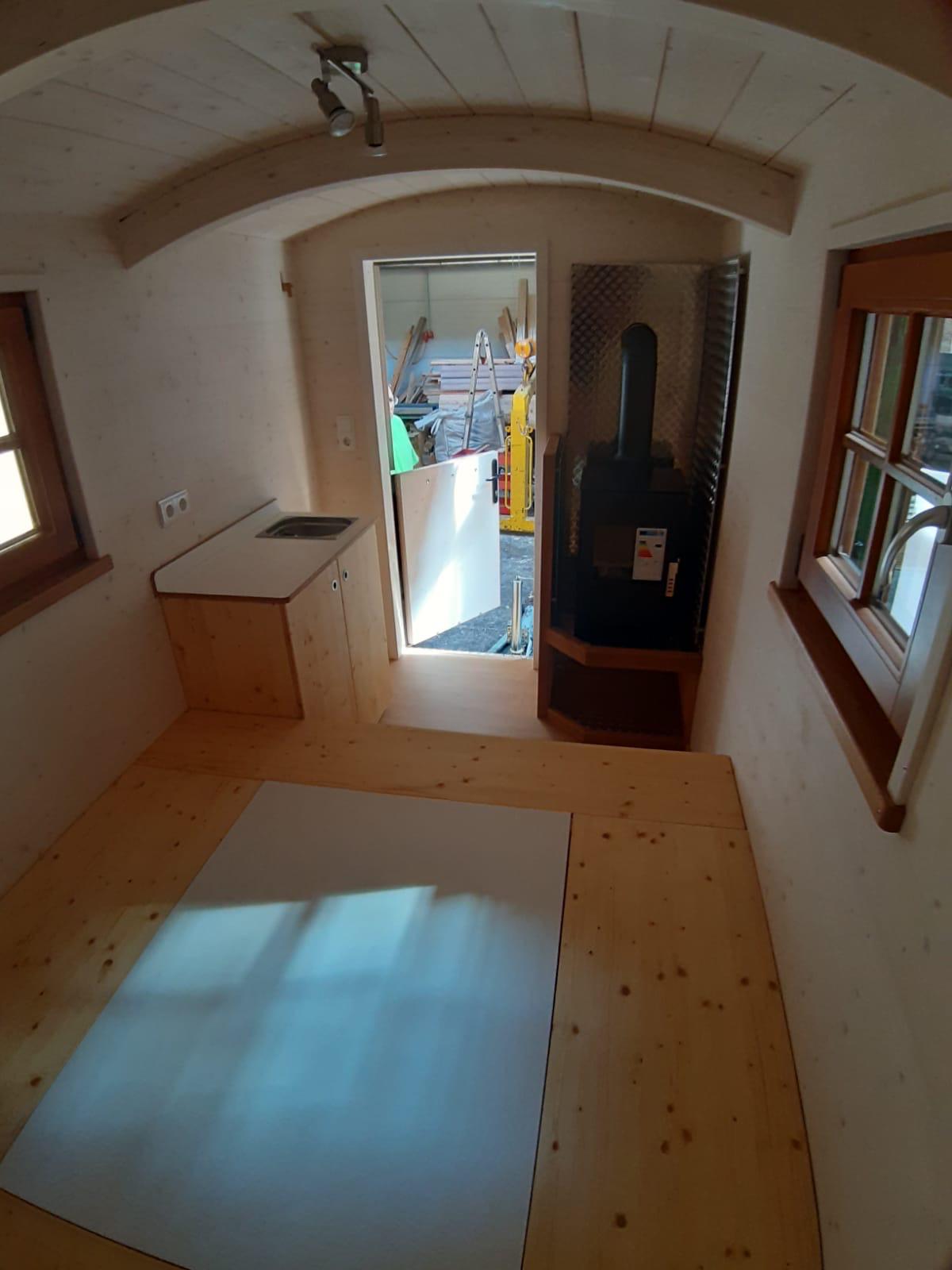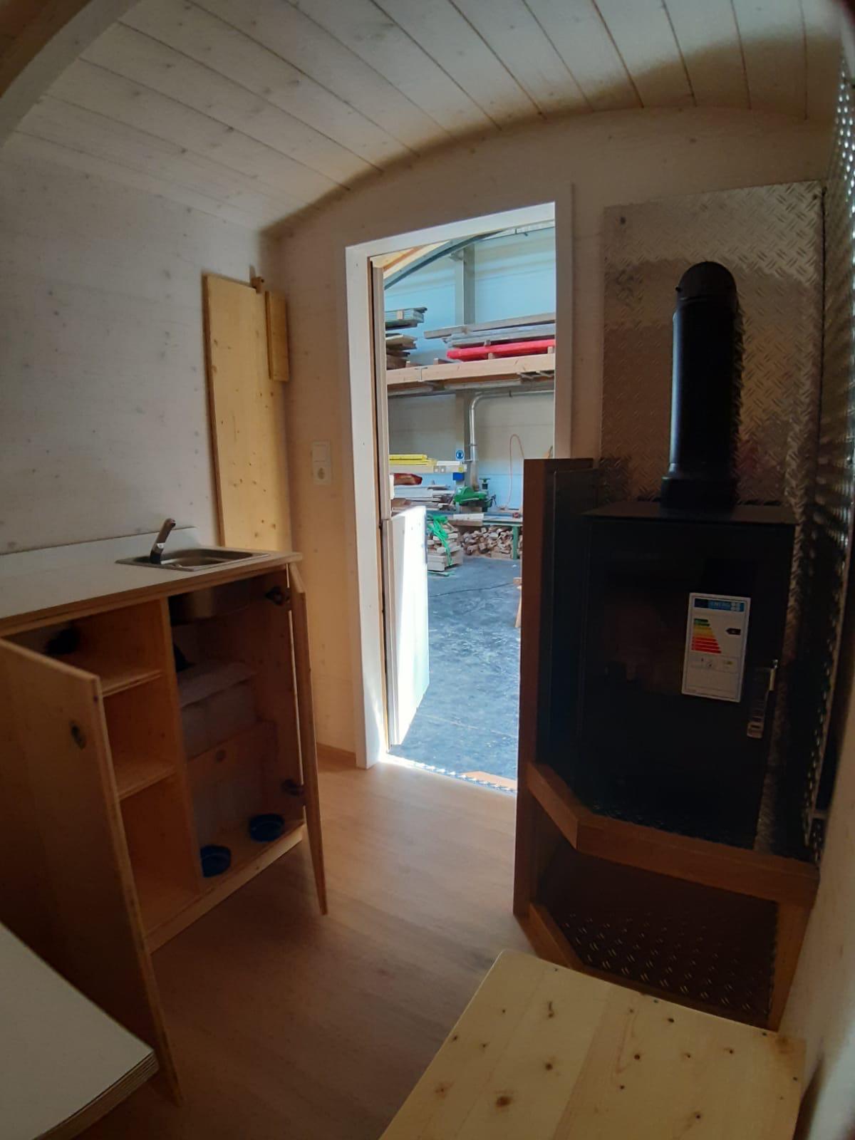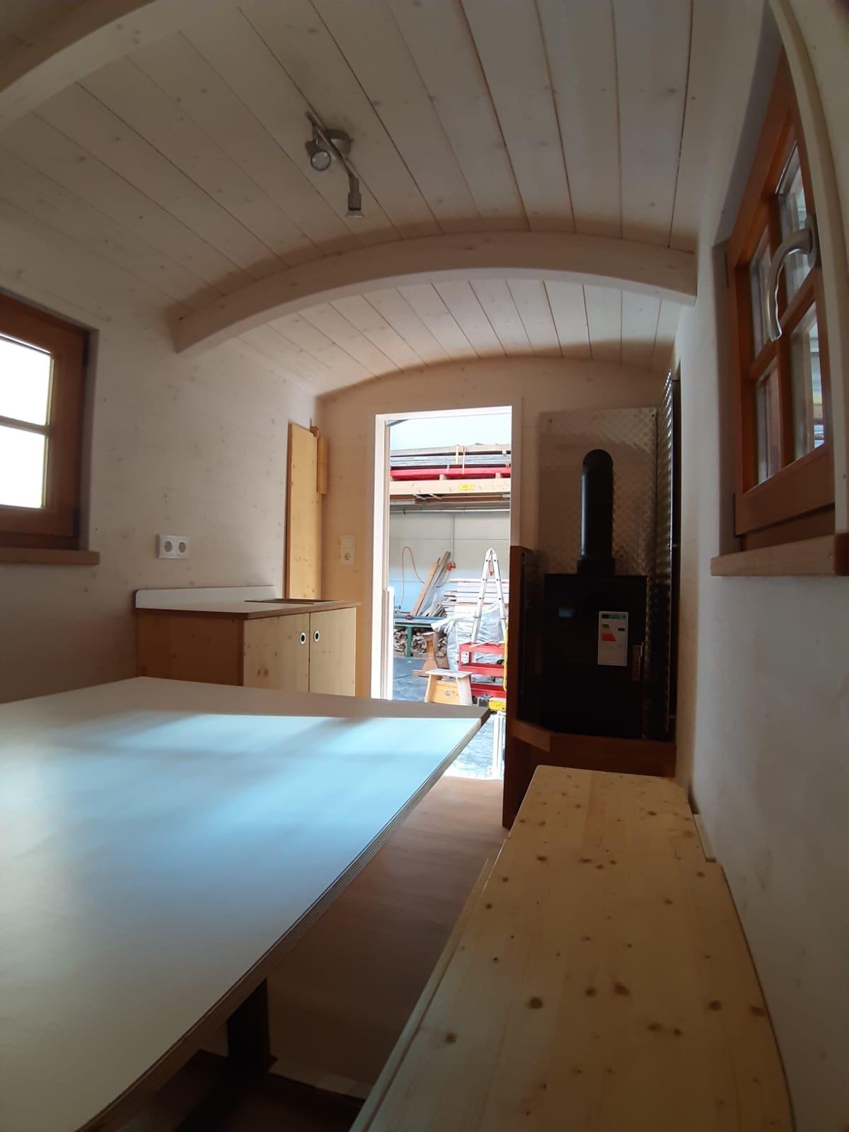 • Innenausbau mit Ofen, Möbeln und Stauraum